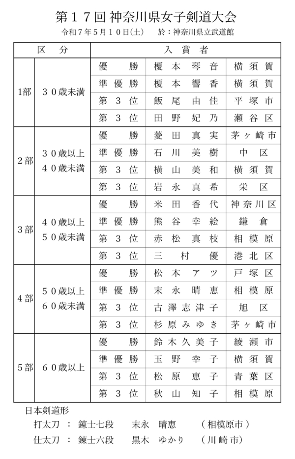 【結果】第17回 神奈川県女子剣道大会 2025.5.10
