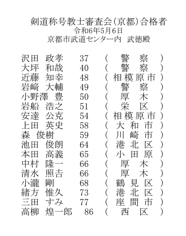 【合格者】剣道称号教士審査会 京都 (R7.5.6)