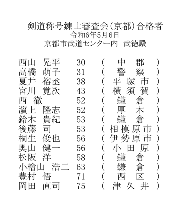 【合格者】剣道称号教士審査会 京都 (R7.5.6)