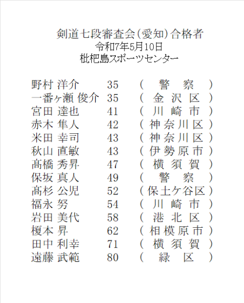 【合格者】剣道七段審査 愛知 (R7.5.10)