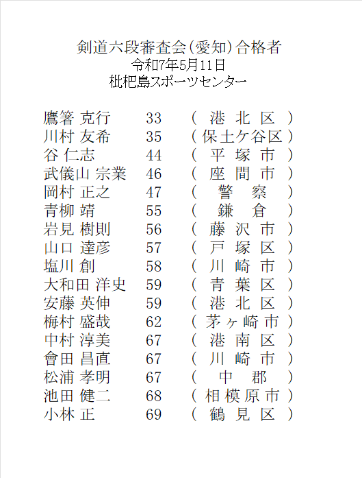 【合格者】剣道六段審査 愛知 (R7.5.11)
