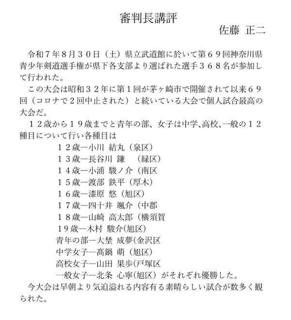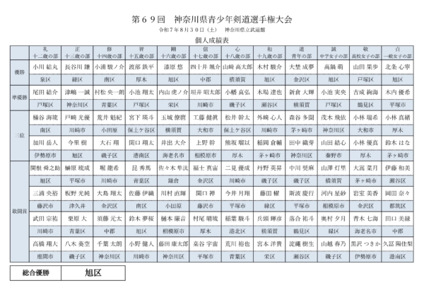 総合優勝 旭区 12歳の部 決勝動画 13歳の部 決勝動画 14歳の部 決勝動画 15歳の部 決勝動画 16歳の部 決勝動画 17歳の部 決勝動画 18歳の部 19歳の部 決勝動画 青年の部 決勝動画 中学女子の部 決勝動画 高校女子の部 決勝動画 一般女子の部 決勝動画 団体結果 トーナメント詳細