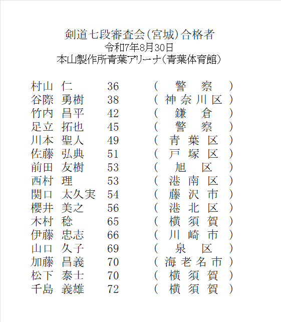 【合格者】剣道七段審査 宮城 (R7.8.30)