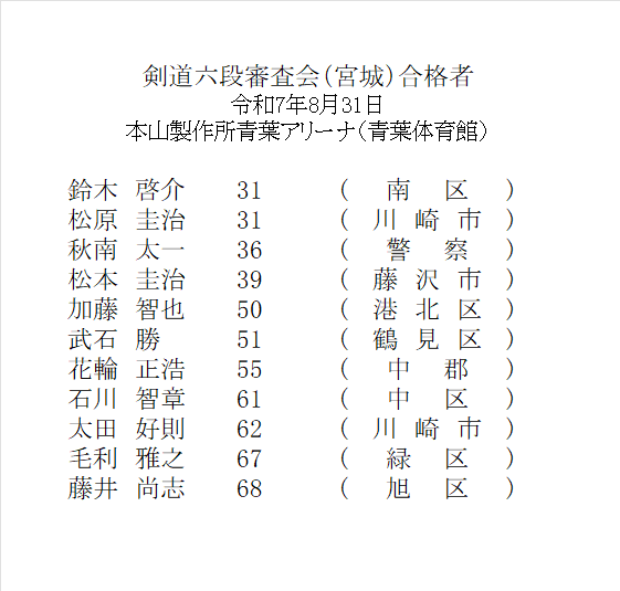 【合格者】剣道六段審査 宮城 (R7.8.31)