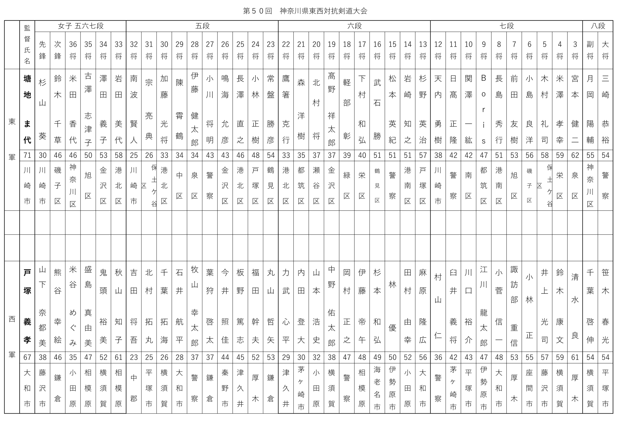 10月13日(月・祝)に開催する第50回 神奈川県東西対抗剣道大会の監督並びに選手選考結果を発表します。選考された選手は所定の時間(受付時間は午前の母子大会閉会式終了後、12:30~12:55 開会式13時※)に集合してください。※受付時間・開会式は当初の予定から変更となっておりますのでご注意ください。