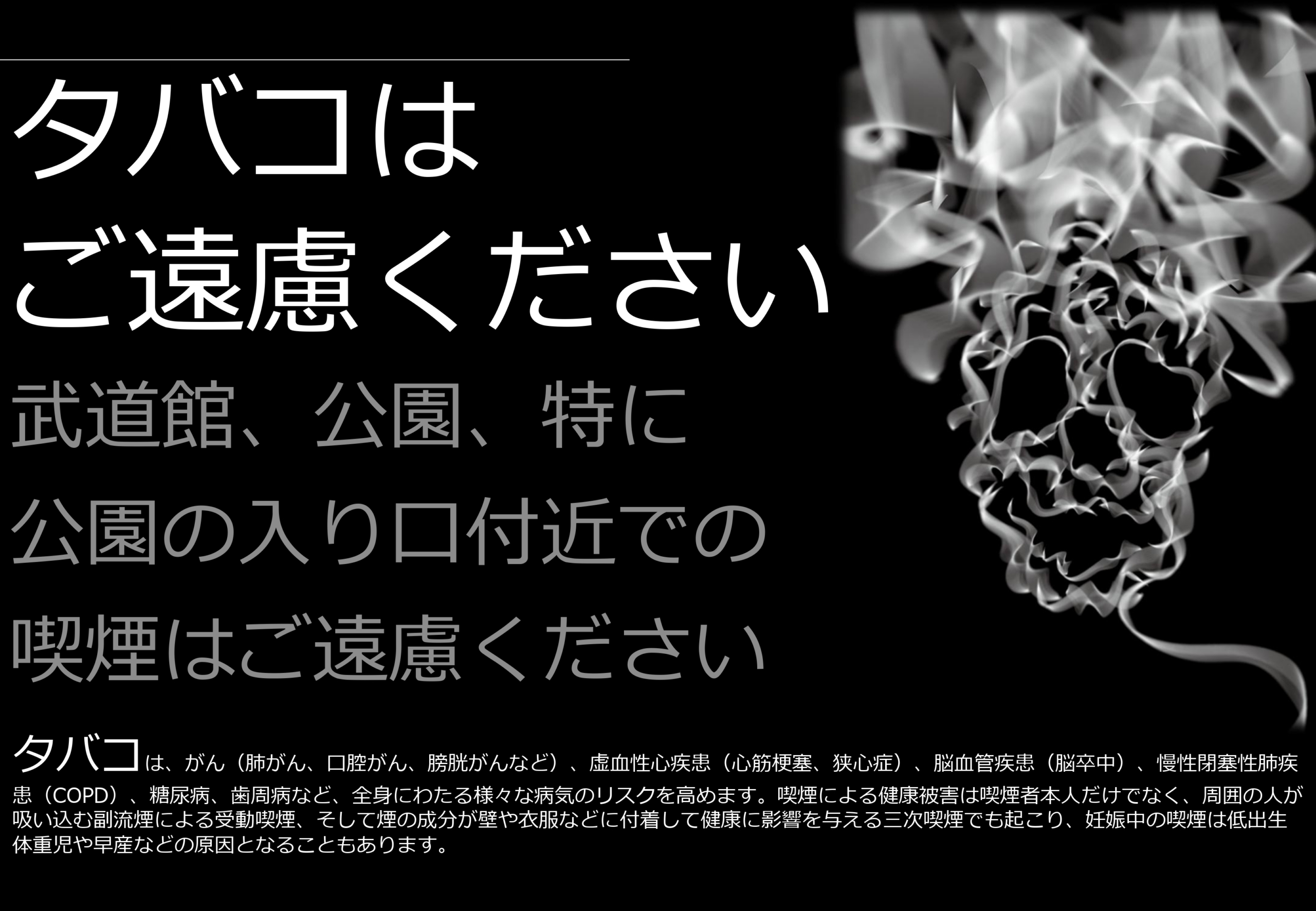 横浜市の公園は令和7年4月から禁煙となりました。県立武道館での行事の際、公園並びに公園の入り口付近での喫煙はご遠慮ください。