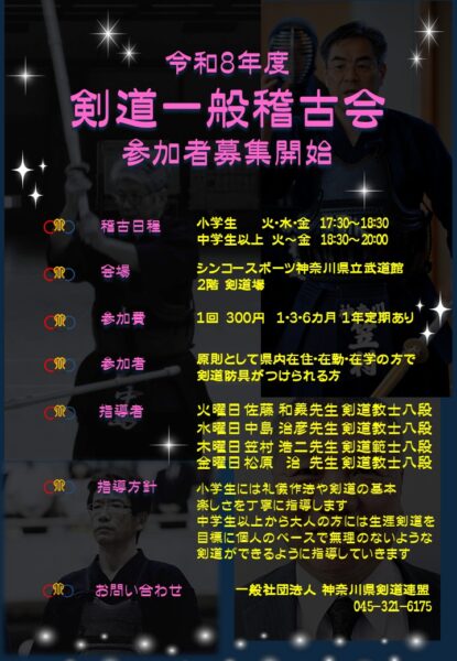 参加資格:神奈川県剣道連盟の登録会員で、剣道七段以上の段位を受有するもの
