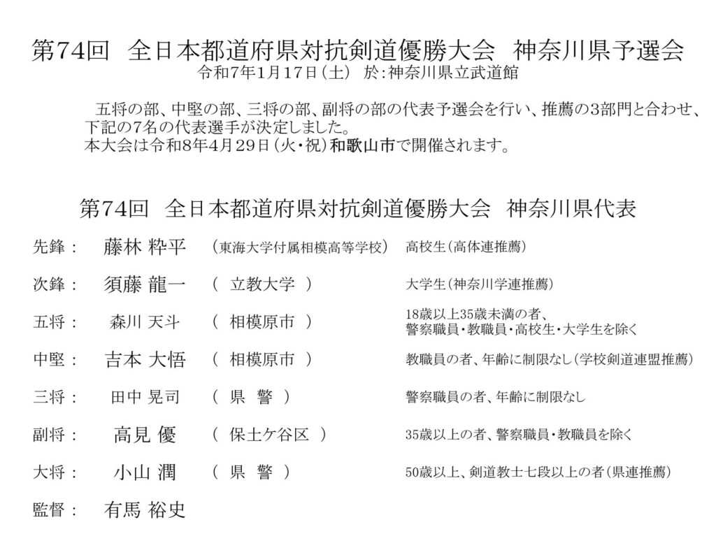 【結果】第74回 全日本都道府県対抗剣道優勝大会 神奈川県予選会
