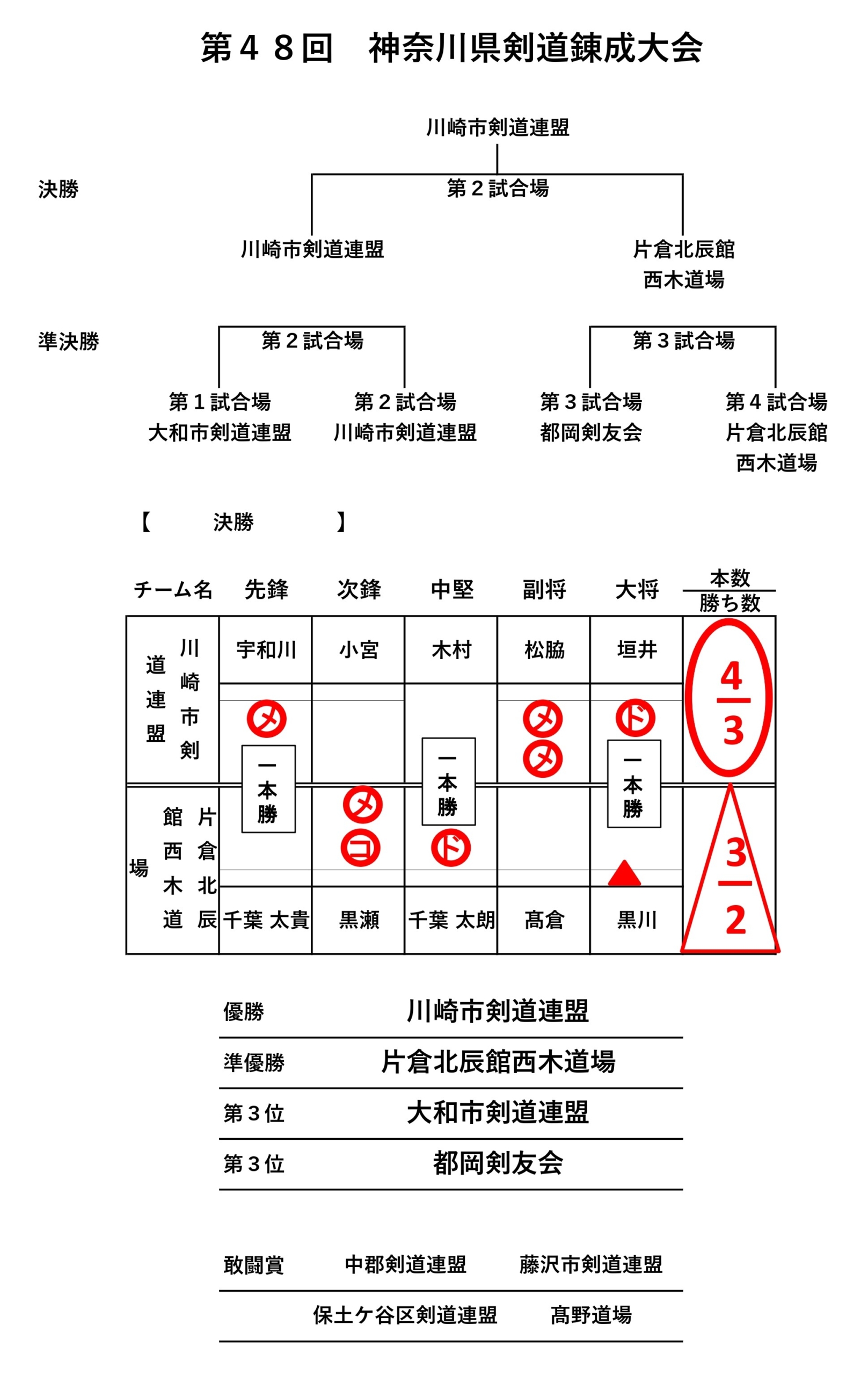 決勝戦は、川崎市剣道連盟対片倉北辰館西木道場の対戦、大将戦にもつれ込む大接戦となった。先鋒戦は、川崎の宇和川選手がメンの一本勝ち、次鋒戦は、西木道場の黒瀬選手がコテとメンの二本勝ち、中堅戦は、西木道場の千葉選手がドウの一本勝ちで王手をかける。後のない川崎は副将の松脇選手が積極的に技を出しメンとメンの二本勝ちし、大将戦を迎えた。試合中盤、川崎の大将の垣井選手が西木道場の大将の黒川選手のメンに対して、返しドウを決めた。黒川選手は取り返そうと積極的に技を出すも、試合時間終了となり、川崎市剣道連盟チームの優勝が決まった。