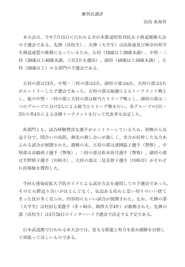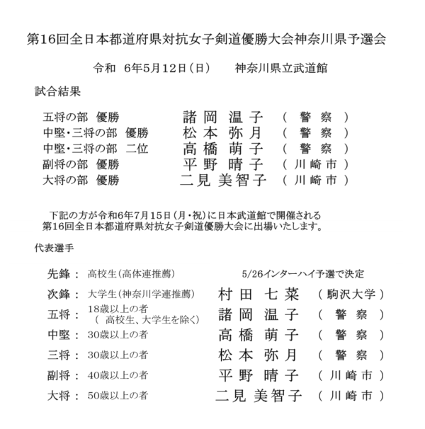 【結果】第16回 神奈川県女子剣道大会(R6.5.11)