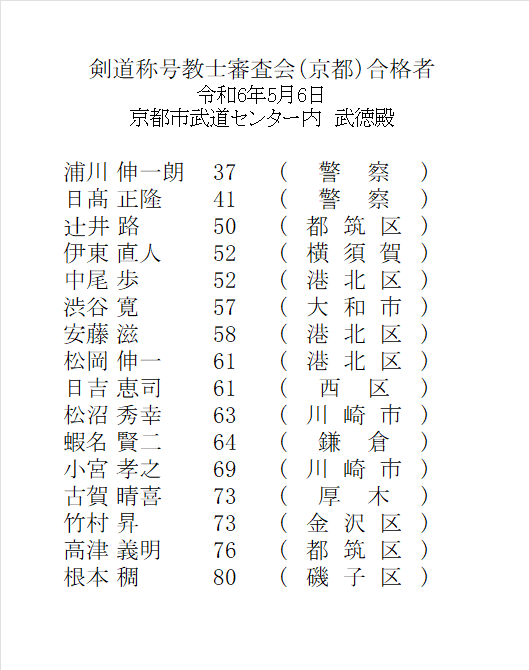 【合格者】剣道称号教士審査会 京都 (R6.5.6)