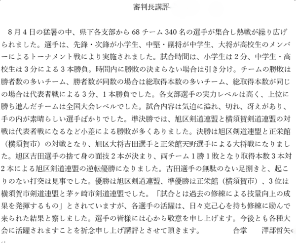 ※竹刀の取り間違えが大量に発生しています。出場者は自分の荷物の確認をしてください。尚、忘れ物(水筒・三脚)の取り置き、問い合わせは武道館までお願いします。 優勝 旭区剣道連盟 準優勝 正栄館(横須賀) 第3位 横須賀剣道連盟 第3位 茅ヶ崎市剣道連盟 敢闘賞 斎正館瀧本道場 相模原剣道連盟 川崎御幸剣友会 高野道場 大会結果詳細はこちらから