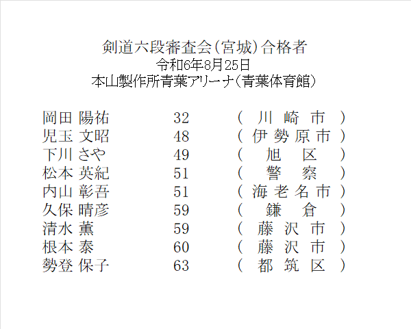 【合格者】剣道六段審査 宮城 (R6.8.25)