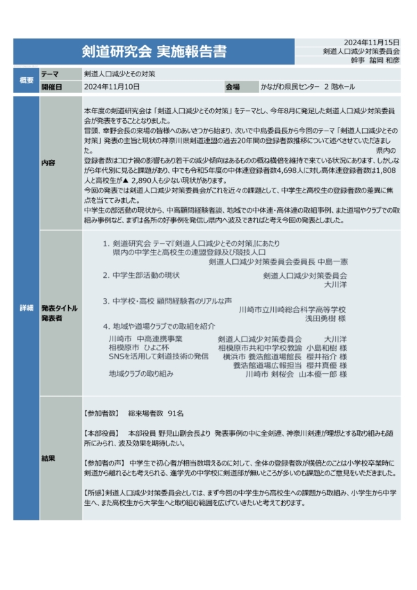 11/10(日)剣道研究会の詳細を報告します。 剣道少子化の対策に是非ともご活用ください。 1.概要 2.中学生部活動の現状 3.中学生・高校生 顧問経験者のリアルな声 4.地域や道場クラブでの取り組み 4-1.中高連携の川崎市 4-2.相模原市 たまご杯、ひよこ杯 4-3 SNS活用 養浩館 4-4 地域密着 剣桜会