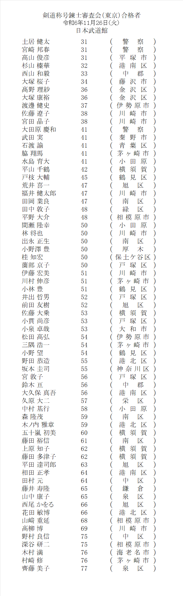 【合格者】剣道称号錬士審査会 東京 (R6.11.26)